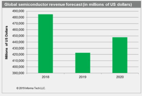 IHS Markit預(yù)計,2020年全球半導體市場收入將出現(xiàn)反彈,從2019年的4228億美元增至4480億美元,增幅會達到5.9%。這可能會讓英特爾、三星、臺積電、高通、Broadcom等全球頂尖半導體公司松一口氣。